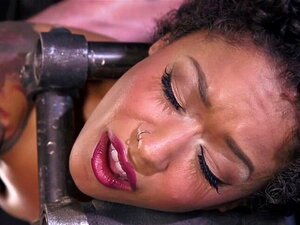 L'ébène enfermé dans un dispositif de bondage est tourmenté. Enfermée dans un dispositif métallique, l'esclave ébène aux petits seins Skin Diamond en position extrême se fait tourmenter puis son maître la met dans un autre appareil et fait vibrer son cli